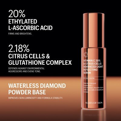 Propanediol, Glycerin, 3-O-Ethyl Ascorbic Acid, Benzimidazole Diamond Amidoethyl Urea Carbamoyl Propyl Polymethylsilsesquioxane, Dimethyl Isosorbide, Helianthus Annuus Seed Wax, Polyglyceryl-10 Tristearate, Ethoxydiglycol, Dicaprylyl Ether, Aqua (Water), Caprylyl Glycol, Citrus Aurantium Dulcis Callus Culture Extract, Glutathione, Acetyl Cysteine, Dimethylmethoxy Chromanol, Ergothioneine, Tocopherol, Gluconolactone, Leuconostoc/Radish Root Ferment Filtrate, Xanthan Gum, Silica, Sodium Benzoate, Calcium Gluconate, Phenoxyethanol.